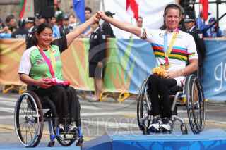 GUADALAJARA, JALISCO, 19NOVIEMBRE2011.- La mexicana Ivonne Reyes consiguió la medalla de plata en la prueba de ciclismo de ruta femenil H3-4 de los juegos Paranamericanos Guadalajara 2011. La norteamericana Mónica Bascio obtuvó la presea de oro. FOTO: FERNANDO CARRANZA GARCÍA/CUARTOSCURO.COM
