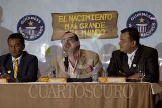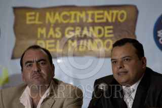 MÉXICO, D.F., 22NOVIEMBRE2011.- Alejandro Rosas, historiador, y Fabián Rojas Quiroz, director y creador del concepto del "Nacimiento Más Grande del Mundo", que se montará en el Estadio Azteca a partir del 2 de diciembre del 2011. Esta monumental representación del nacimiento de Jesús de Nazaret, estará abierto desde las 10 de la mañana a las cero horas todos los días del 2 de diciembre al 15 de enero de 2012. Esta increíble escenografía contará con 57 escenas del pasaje bíblico, recreando antiguas casas de hasta 7 metros y más de mil figuras de tamaño real con movimiento y sorprendentes replicas humanas que interactuarán con el público recreando las costumbre, tradiciones y oficios de más importantes de Belén. FOTO: MOISÉS PABLO/CUARTOSCURO.COM
