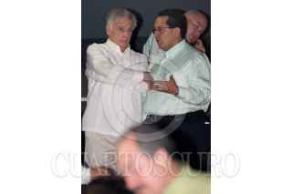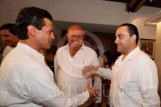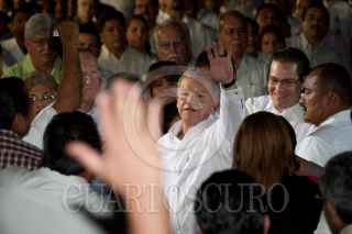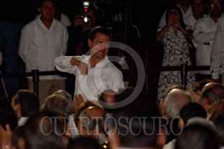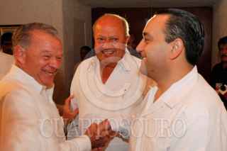 VILLAHERMOSA, TABASCO, 22NOVIEMBRE2011.- Ándres Granier Melo, gobernador de la entidad, Carlos Romero Deschamps, líder sindical de los petroleros, y Roberto Borge Ángulo, gobernador de Quintana Roo, previó a la presentación del V Informe de Gobierno del "Químico". FOTO; MARCO POLO GUZMÁN HERNÁNDEZ/CUARTOSCURO.COM