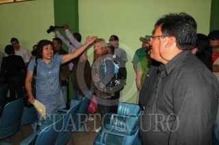 OAXACA, OAXACA, 23NOVIEMBRE2011.- Porfirio Donínguez Muñozcano, dirigente del Comité de Familiares de los Desaparecidos, Asesinados y Presos Políticos de Oaxaca (COFADPPO) rompió relaciones con Isaac Torres Carmona reprensentante en Oaxaca de la Liga Mexicana por la Defensa de los Derechos Humanos (LIMEDDH), lo anterior por los cerca de once millones de pesos destinados por el gobierno estatal para las víctimas del 2006. Dicho recurso se entregó a 44 personas, faltando 20 más, tocándoles a cada uno 170 mil pesos, sin embargo la indemnización únicamente se entregó a los representados por la LIMEDDH. Dimes y diretes se dieron al interior del auditorio de la Sección 22, donde los dirigentes y sus representados se acusaban mutuamente de buscar quedarse con el dinero. FOTO: ARTURO PÉREZ ALFONSO/CUARTOSCURO.COM