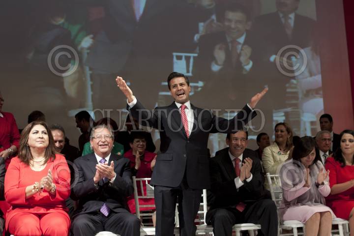 MÉXICO, D.F., 23NOVIEMBRE2011.- Enrique Peña Nieto, aspirante a la Presidencia de la República por el PRI, felicita a Diva Gastélum, quien tomo protestas como nueva dirigente de la Unión Nacional de Mujeres del PRI (UNMPRI), en una ceremonia realizada en el CEN priista. FOTO: MOISÉS PABLO/CUARTOSCURO.COM