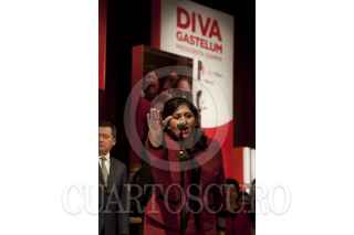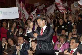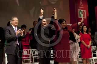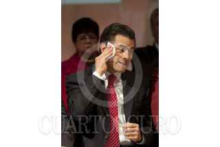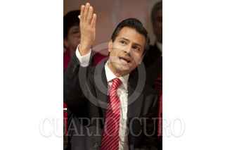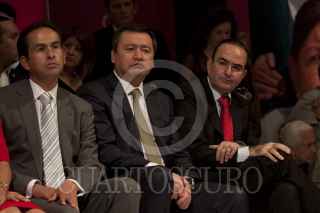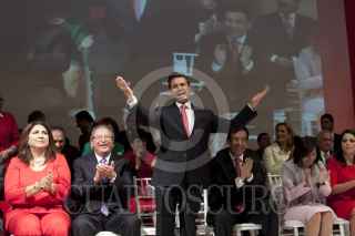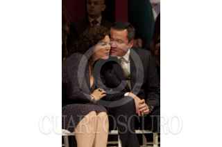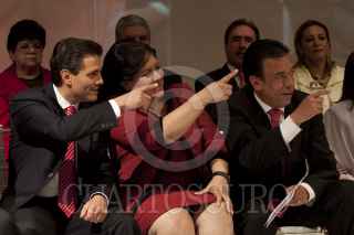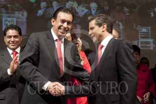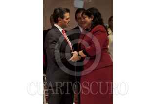 MÉXICO, D.F., 23NOVIEMBRE2011.- Enrique Peña Nieto, aspirante a la Presidencia de la República por el PRI, felicita a Diva Gastélum, quien tomo protestas como nueva dirigente de la Unión Nacional de Mujeres del PRI (UNMPRI), en una ceremonia realizada en el CEN priista. FOTO: MOISÉS PABLO/CUARTOSCURO.COM