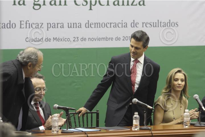 MÉXICO, D.F., 23NOVIEMBRE2011.- Guillermo Ortiz, platica con Enrique Peña Nieto, aspirante a la presidencia de la república, durante la presentación del libro del ex-mandatario mexiquense, titulado México la Gran Esperanza. FOTO: SAÚL LÓPEZ/CUARTOSCURO.COM