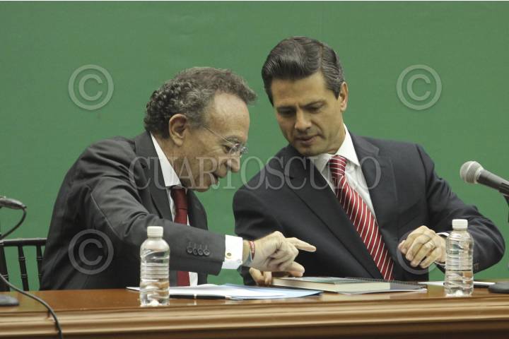 MÉXICO, D.F., 23NOVIEMBRE2011.- Guillermo Ortiz, platica con Enrique Peña Nieto, aspirante a la presidencia de la república, durante la presentación del libro del ex-mandatario mexiquense, titulado México la Gran Esperanza. FOTO: SAÚL LÓPEZ/CUARTOSCURO.COM