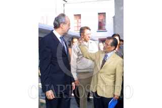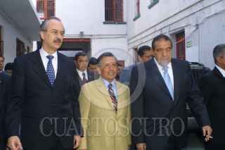 MEXICO D.F 07 DICIEMBRE 2004.- Fransisco Gil Diaz, secretario de Hacienda y Heladio Ramírez, lider de la CNC, platican durante el evento en donde la tienda Waltmart venderá los productos agricolas de afiliados a la CNC en sus tiendas de autoservicio. FOTO: /CUARTOSCURO.COM