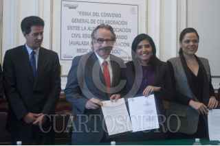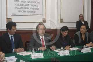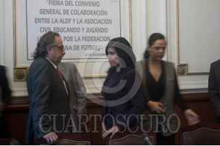 MÉXICO, D.F., 24NOVIEMBRE2011.- Alejandra Barrales, presidenta de la Comisión de Gobierno y Decio de María, Secretario General de la Federación de Mexicana de Futbol, acompañados de Pablo Cañedo White, Presidente del Sector Aficionado en la Federación Mexicana de Futbol, Marina Gómez del Campo, Legisladora del PAN, realizaron la firma del convenio entre la ALDF y la Asociación Civil Educando y Jugando, avalada por la Federación Mexicana de Fútbol, en las instalaciones de la Asamblea Legislativa del Distrito Federal. FOTO: GUILLERMO PEREA/CUARTOSCURO.COM