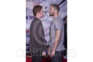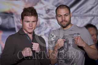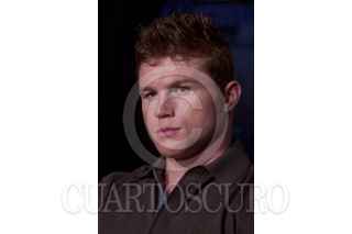 MÉXICO, D.F., 24NOVIEMBRE2011.- Los boxeadores Saúl "El Canelo" y Kermit Cintrón, durante la conferencia que ofrecieron, previo a la pelea de este sábado en la Monumental Plaza de Toros México. FOTO: ISAAC ESQUIVEL/CUARTOSCURO.COM