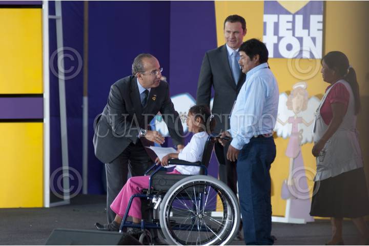 SAN ANDRÉS CHOLULA, PUEBLA, 24NOVIEMBRE2011.- La tarde de hoy el Presidente, Felipe Calderón HInojosa inauguró el Centro de Rehabilitación Teletón en el estado de Puebla, fue acompañado por el gobrenador del estado, Rafaél Moreno Valle. El propio presidente interrumpió su discurso inaugural para subir al templete a la primera familia que será atendida en el Centro. FOTO: FRANCISCO RODRÍGUEZ/CUARTOSCURO.COM