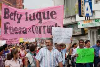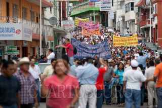 VILLAHERMOSA, TABASCO, 25NOVIEMBRE2011.- Roger Arias dirigente estatal del SITET realizo un plantón con integrantes del magisterio del SNTE en la Quinta Grijalva; de igual manera marcharon por principales calles con pancartas e insultos hacia el gobierno de Andrés Granier Melo, donde participaron al menos medio millar de educadores de distintos centros escolares. FOTO: MARCO POLO GUZMÁN HERNÁNDEZ/CUARTOSCURO.COM