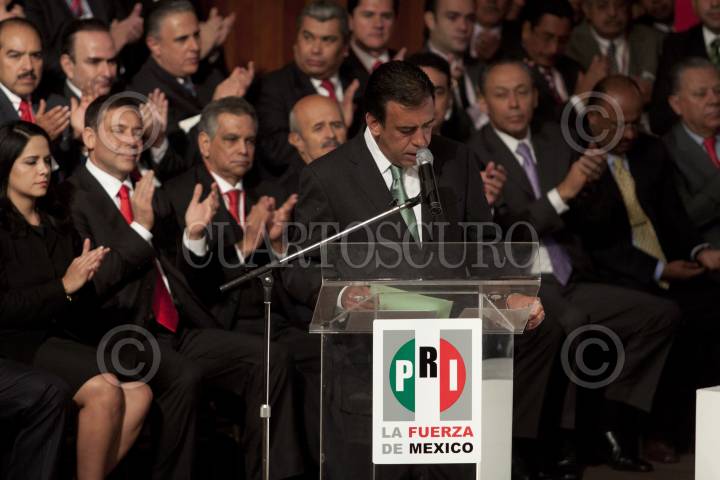 MÉXICO, D.F., 02DICIEMBRE2011.- Humberto Moreira, presentó su renuncia ante el Consejo Político del PRI. Esto tras largos meses en los que se exhibió una serie de irregularidades en una serie de créditos obtenidos por el gobierno coahuilense en la gestión del Moreira. El profesor Moreira indico que deja el partido por que no permitirá que se le haga daño por lo que denomino una "Guerra Mediática". En su lugar tomó protesta Cristina Díaz ante un auditorio Plutarco Elías Calles del CEN del PRI. FOTO: MOISÉS PABLO/CUARTOSCURO.COM