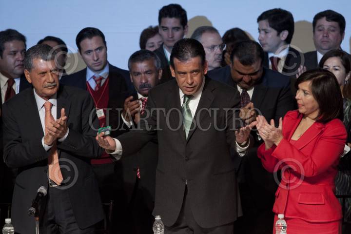 MÉXICO, D.F., 02DICIEMBRE2011.- Humberto Moreira, presentó su renuncia ante el Consejo Político del PRI. Esto tras largos meses en los que se exhibió una serie de irregularidades en una serie de créditos obtenidos por el gobierno coahuilense en la gestión del Moreira. El profesor Moreira indico que deja el partido por que no permitirá que se le haga daño por lo que denomino una "Guerra Mediática". En su lugar tomó protesta Cristina Díaz ante un auditorio Plutarco Elías Calles del CEN del PRI. FOTO: MOISÉS PABLO/CUARTOSCURO.COM