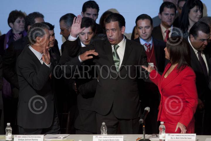 MÉXICO, D.F., 02DICIEMBRE2011.- Humberto Moreira, presentó su renuncia ante el Consejo Político del PRI. Esto tras largos meses en los que se exhibió una serie de irregularidades en una serie de créditos obtenidos por el gobierno coahuilense en la gestión del Moreira. El profesor Moreira indico que deja el partido por que no permitirá que se le haga daño por lo que denomino una "Guerra Mediática". En su lugar tomó protesta Cristina Díaz ante un auditorio Plutarco Elías Calles del CEN del PRI. FOTO: MOISÉS PABLO/CUARTOSCURO.COM