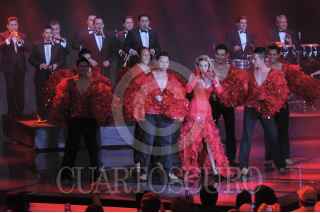 MÉXICO, D.F., 03DICIEMBRE2011.- La cantante Aracely Arambula y madre de los dos hijos de Luis Miguel, canto junto a la Sonora Santanera en el Teletón que arrancó la noche de ayer en el foro 2 de Televisa San Angel. FOTO: FRANCISCO RODRÍGUEZ/CUARTOSCURO.COM