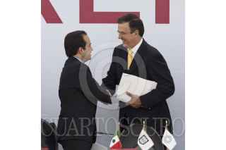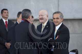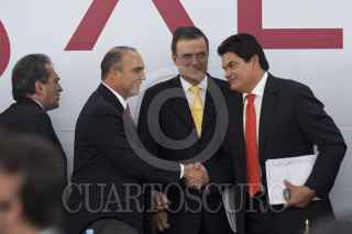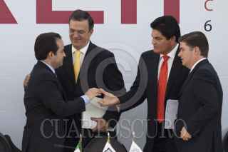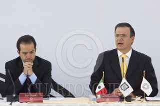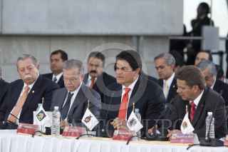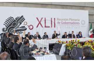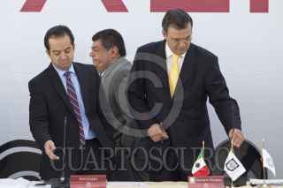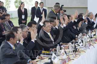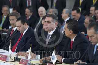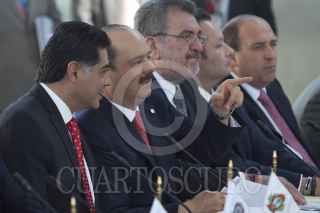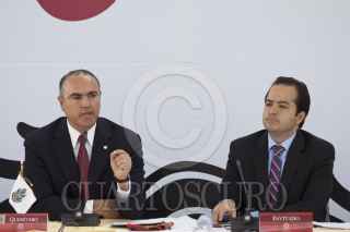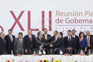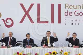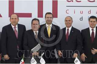 MÉXICO, D.F. 06DICIEMBRE2011.- Jorge Osuna Millan, gobernador del estado de Baja California; Francisco Olvera Ruíz gobernador del estado de Hidalgo; Fernando Ortega Bernes, gobernador del estado de Campeche; Ruben Moreira, gobernador del estado de Coahuila; Carlos Lozano de la Torre, gobernador del estado de Aguascalientes; Marcelo Ebrard, jefe de gobierno del Distrito Federal; José Calzada Rovirosa, gobernador del estado de Queretaro; Roberto Borgue, gobernador de Quintana Roo; Miguel Álonso Reyes, gobernador del estado de Zacatecas; Rafael Moreno Valle, gobernador del estado de Puebla; Ivonne Ortega, gobernadora del estado de Yucatán y Egidio Torres Cantú, gobernador del estado de Tamaulipas durante la XLII Reunión Plenaria de Gobernadores de la Conferencia Nacional de Gobernadores (CONAGO) que se realizó en el C4. FOTO: RODOLFO ANGULO/CUARTOSCURO.COM