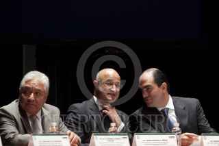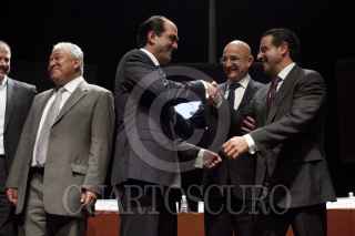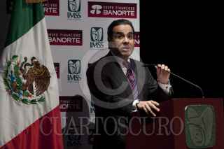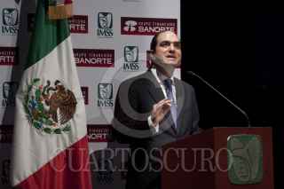 MÉXICO, D.F., 06DICIEMBRE2011.- Valdemar Gutiérrez Fragoso, líder del sindicato del IMSS, Daniel Karam Tomeuh, director del Instituto Mexicano del Seguro Social, Pedro Ordorica Leñero, titular de la Comisión Nacional del Sistema del Ahorro para el Retiro, y Alejandro Valenzuela del Río, director general de Grupo Finaciero Banorte, al finalizar la conferencia en la cual se anunció la fusión de Afore XXI y Afore Banorte, la ceremonia se realizó en las instalaciones del seguro social. FOTO: MOISÉS PABLO/CUARTOSCURO.COM