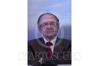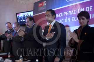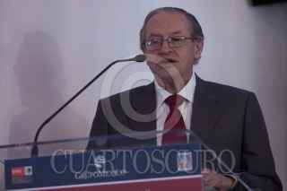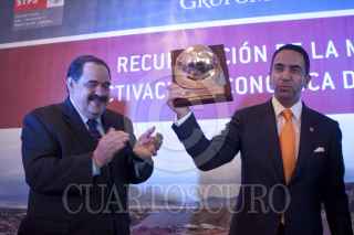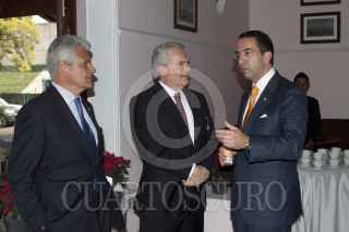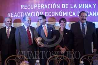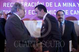 MÉXICO, D.F., 06DICIEMBRE2011.- Xavier García de Quevedo Topete, presidente de Minera México, Javier Lózano, secretario del Trabajo y Previsión Social, y Héctor Larios Córdova, secretario de Gobierno de Sonora, al finalizar la conferencia de prensa en la cual se dió a conocer el proceso de recuperación de la región de Cananea, Sonora, y de la mina Buenavista del Cobre, en lo que se le denominó "Informe de avances en la estrategia para la reactivación económica de Cananea", en el Campo Marte. FOTO: MOISÉS PABLO/CUARTOSCURO.COM