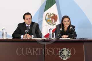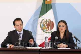 MÉXICO, D.F., 07DICIEMBRE2011.- Alejandro Poiré, secretario de gobernación y Alejandra Sota Mirafuentes, coordinadora general de Comunicación Social de la presidencia de la República y vocera del gobierno federal, ofrecieron un mensaje a medios de comunicación en donde dieron a conocer la operación “Huésped”, con la que el gobierno federal impidió el ingreso de Saadi Gadafi, hijo del ex líder libio Muamar Gadafi, a territorio mexicano. FOTO: CUARTOSCURO.COM