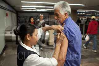 MÉXICO, D.F., 07DICIEMBRE2011.- La Secretaría de Salud local aplica vacunas contra la influenza en 19 estaciones del Metro a menores de edad y personas mayores de 60 años. El titular de la dependencia, Armando Ahued, encabezó el arranque de la campaña en la estación Zócalo, donde llamó a la población a vacunarse, debido a que el inmunológico debe aplicarse cada año. La secretaría aplicará un total de 719 mil 241 inmunológicos. FOTO: MOISÉS PABLO/CUARTOSCURO.COM