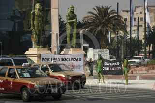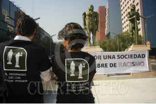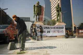 MÉXICO, D.F., 07DICIEMBRE2011.- Integrantes de la Consejo Nacional para Prevenir el Delito (Conapred), colocaron en avenida Paseo de la Reforma y Juárez un par de Indios Verdes que representan a Icóaltl y Ahuizotl con la que comenzaron una campaña en contra del racismo en México. FOTO: GUILLERMO PEREA/CUARTOSCURO.COM