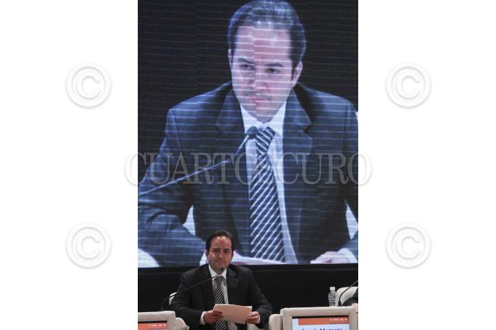 MÉXICO, D.F., 08DICIEMBRE2011.- Diego Fernández de Cevallos, ex candidato a la Presidencia por el PAN junto a Alejandro Poire, Secretario de Gobernación durante el II Foro de la Democracia Latinoamericana que tuvo lugar en el anfiteatro Simón Bolívar del Antiguo Colegio de San Idelfonso. FOTO: ENRIQUE ORDÓÑEZ/CUARTOSCURO.COM