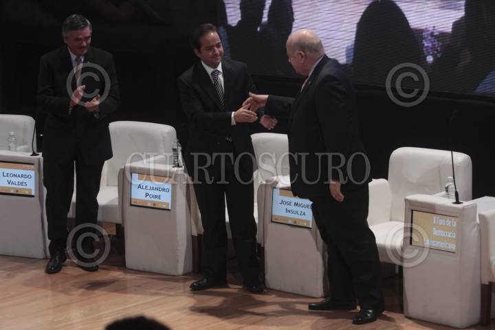 MÉXICO, D.F., 08DICIEMBRE2011.- Diego Fernández de Cevallos, ex candidato a la Presidencia por el PAN junto a Alejandro Poire, Secretario de Gobernación durante el II Foro de la Democracia Latinoamericana que tuvo lugar en el anfiteatro Simón Bolívar del Antiguo Colegio de San Idelfonso. FOTO: ENRIQUE ORDÓÑEZ/CUARTOSCURO.COM