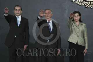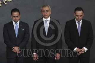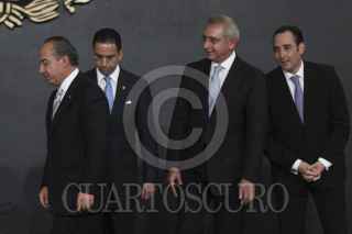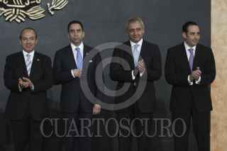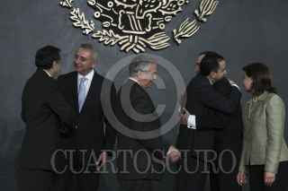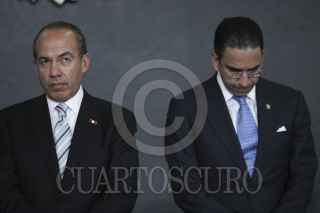 MÉXICO, D.F., 14DICIEMBRE2011.- José Guadalupe Tarcisio Rodríguez Martínez, Rafael Morgan Ríos, Rosalinda Vélez, Felipe Calderón Hinojosa, presidente de México, Javier Lozano Alarcón, Salvador Vega Casillas y Roberto Gil Zuarth en el anuncio de movimientos en el gabinete. FOTO: IVÁN STEPHENS/CUARTOSCURO.COM