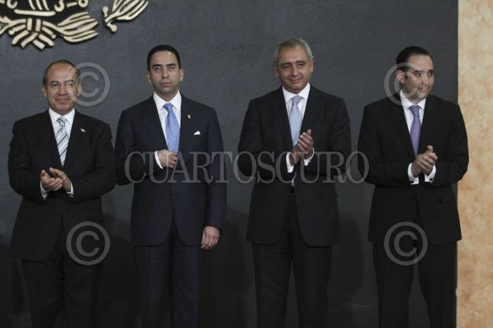 MÉXICO, D.F., 14DICIEMBRE2011.- José Guadalupe Tarcisio Rodríguez Martínez, Rafael Morgan Ríos, Rosalinda Vélez, Felipe Calderón Hinojosa, presidente de México, Javier Lozano Alarcón, Salvador Vega Casillas y Roberto Gil Zuarth en el anuncio de movimientos en el gabinete. FOTO: IVÁN STEPHENS/CUARTOSCURO.COM
