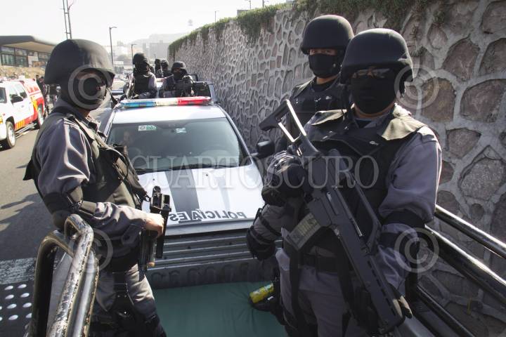 QUERÉTARO, QUERÉTARO, 14DICIEMBRE2011.- Este dia dió inicio el operativo de seguridad de la CONAGO, con la participación de las policías de Zacatecas, Aguascalientes, San Luis Potosí, Querétaro, Ejército Mexicano, PGR, PGJ. En el operativo dieron el banderazo de salida los gobernadores Cesar Duarte, José Luis Torranzo Y José Calzada Presidente de la CONAGO. FOTO: DEMIAN CHÁVEZ/CUARTOSCURO.COM