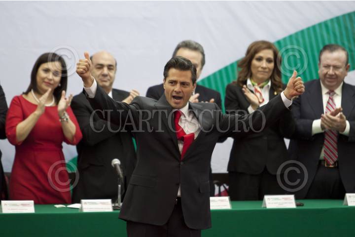 MÉXICO, D.F. 17DICIEMBRE2011.- Manlio Fabio Beltrones, Beatriz Paredes, Enrique Peña Nieto y Mariano Palacios Alcocer durante el evento en donde Enrique Peña Nieto recibió la constancia de candidato único presidencial del Partido Revolucionario Institucional a la Presidencia de la República que se realizo en la explanada de la sede nacional del PRI. FOTO: RODOLFO ANGULO/CUARTOSCURO.COM