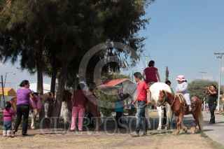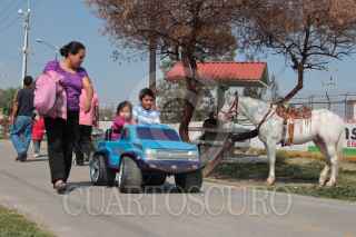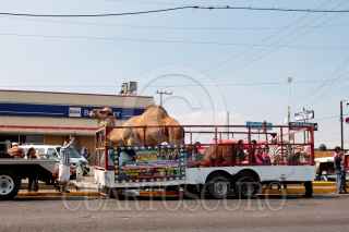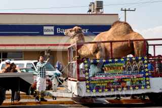 TULTITLAN, ESTADO DE MÉXICO, 25DICIEMBRE2011.- Los trabajadores del circo "Los Hermanos Alegria", sacaron a la calle a un cammelo junto con una cebra por las calles del municipio para darle promocion y que la gente asista a las funciones donde el espectáculo principal son dos tigres presuntamente de Siberia. Los animales de los circos, en muchas de las ocasiones reciben tratos brutales por los dueños ademas que viven con mala calidad de salud, son mal alimentados y muchos se mueren al no adaptarse a la vida encerrados en una jaula. FOTO: ENRIQUE ORDÓÑEZ/CUARTOSCURO.COM