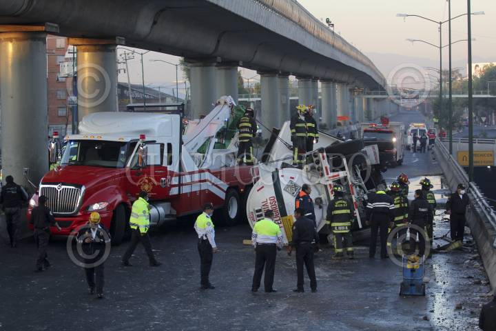MÉXICO, D.F., 27DICIEMBRE2011.- Una pipa cargada con unos 37 mil litros de ácido clorhídrico volcó en carriles centrales de la Avenida Oceanía, al cruce con la calle de Japón en la colonia Transval de la delegación Venustiano Carranza. Granaderos de la SSPDF y elementos de protección civil desalojaron a familias de calles aledañas y cercaron el perímetro tras el intenso olor que despedía dicho químico. Más de ocho horas tardaron para retirar el pesado vehículo. FOTO: SAÚL LÓPEZ/CUARTOSCURO.COM
