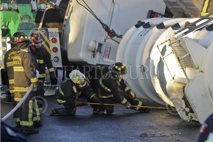 MÉXICO, D.F., 27DICIEMBRE2011.- Una pipa cargada con unos 37 mil litros de ácido clorhídrico volcó en carriles centrales de la Avenida Oceanía, al cruce con la calle de Japón en la colonia Transval de la delegación Venustiano Carranza. Granaderos de la SSPDF y elementos de protección civil desalojaron a familias de calles aledañas y cercaron el perímetro tras el intenso olor que despedía dicho químico. Más de ocho horas tardaron para retirar el pesado vehículo. FOTO: SAÚL LÓPEZ/CUARTOSCURO.COM