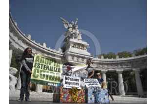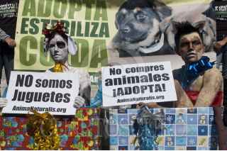 MÉXICO, D.F., 03ENERO2012.- Activistas semidesnudos protestaron frente al Hemiciclo a Juárez en contra de la compraventa de animales e invitaron a la sociedad a concientizar esta problemática de concebir a las mascotas como juguetes u obsequios en vísperas del Día de Reyes. FOTO: DIEGO SIMÓN SÁNCHEZ/CUARTOSCURO.COM