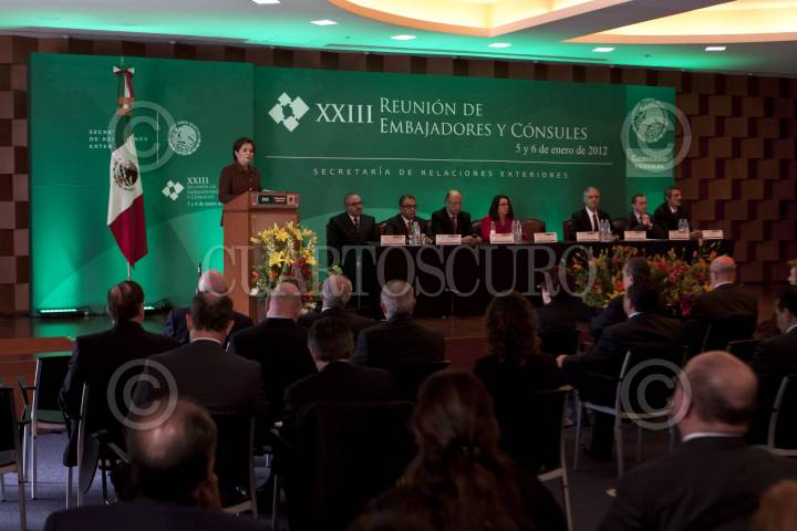 MÉXICO, D.F., 05ENERO2012.- El diputado Porfirio Muñoz Ledo; Agustín Carstens, gobernador del Banco de México y Patricia Castellanos, secretaría de Relaciones Exteriores al termino de la conferencia Evolución Reciente y Perspectivas de la Economía Mexicana en la XXIII Reunión de Embajadores y Cónsules que se realiza en la sede la Cancillería. FOTO: RODOLFO ANGULO/CUARTOSCURO.COM