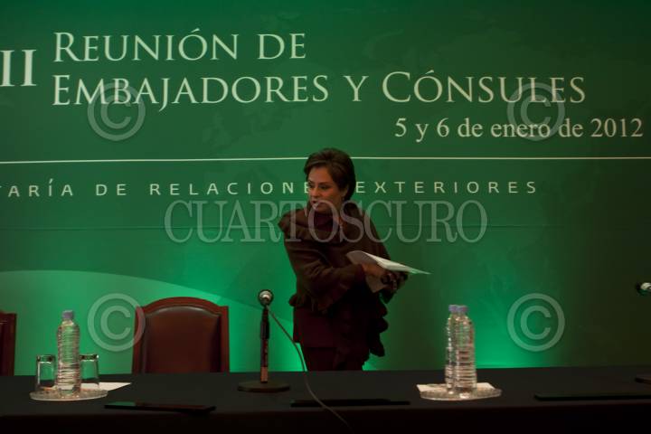 MÉXICO, D.F., 05ENERO2012.- El diputado Porfirio Muñoz Ledo; Agustín Carstens, gobernador del Banco de México y Patricia Castellanos, secretaría de Relaciones Exteriores al termino de la conferencia Evolución Reciente y Perspectivas de la Economía Mexicana en la XXIII Reunión de Embajadores y Cónsules que se realiza en la sede la Cancillería. FOTO: RODOLFO ANGULO/CUARTOSCURO.COM
