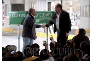 SALTILLO, COAHUILA, 08ENERO2012.- Rubén Moreira Valdéz y Felipe Calderon Hinojosa, gobernador del estado de Coahuila y presidente de México, respectivamente; se saludan durante la inauguración del último tramo del Libramiento Norponiente que une las carreteras Saltillo-Torreón y Saltillo-Zacatecas. FOTO: KARLA ITZEL RUÍZ/CUARTOSCURO.COM