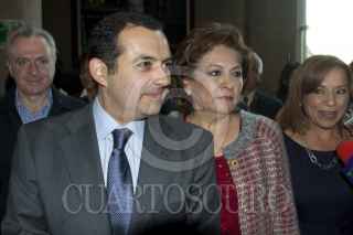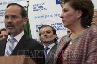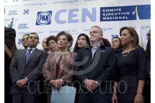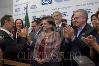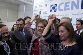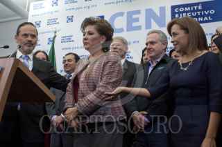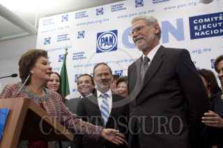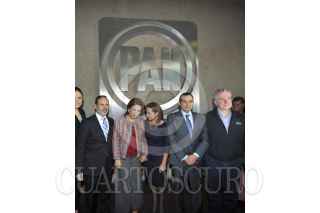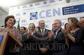 MÉXICO, D.F., 12ENERO2012.- Gustavo Madero, presidente del PAN, Isabel Miranda de Wallace, candidata panista a la Jefatura de Gobierno, y los tres precandidatos presidenciales Josefina Vázquez Mota, Ernesto Codero Arroyo y Santiago Creel, se tomaron la foto del recuerdo tras el destape de la activista, la cual se ha caracterizado por su lucha en contra del secuestro. Miranda señalo que su elección no se debe a su amistad con el Presidente de la República. FOTO: MOISÉS PABLO/CUARTOSCURO.COM