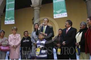 MÉXICO, D.F. 12ENERO2012.- Marcelo Ebrard Casaubon, Jefe del Gobierno del Distrito Federal, acompañado de su esposa Rosalinda Bueso, encabezo la entrega de aparatos auditivos en el Antiguo Palacio de Medicina. FOTO: GUILLERMO PEREA/CUARTOSCURO.COM