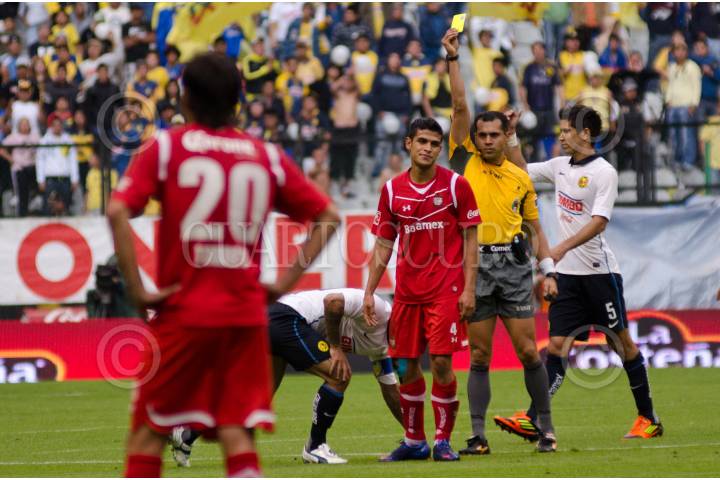 MÉXICO, D.F., 15ENERO2012.- Alfredo Talavera reclama al arbitro una jugada en donde marco penal, durante el encuentro de hoy correpondiente de la fecha 2 del Torneo Clausura 2012 entre el América y Toluca. Estadio Azteca. FOTO: MISAEL VALTIERRA/CUARTOSCURO.COM