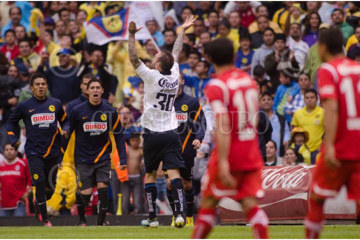 MÉXICO, D.F., 15ENERO2012.- Alfredo Talavera reclama al arbitro una jugada en donde marco penal, durante el encuentro de hoy correpondiente de la fecha 2 del Torneo Clausura 2012 entre el América y Toluca. Estadio Azteca. FOTO: MISAEL VALTIERRA/CUARTOSCURO.COM