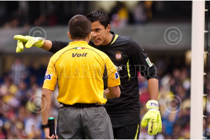 MÉXICO, D.F., 15ENERO2012.- Alfredo Talavera reclama al arbitro una jugada en donde marco penal, durante el encuentro de hoy correpondiente de la fecha 2 del Torneo Clausura 2012 entre el América y Toluca. Estadio Azteca. FOTO: MISAEL VALTIERRA/CUARTOSCURO.COM