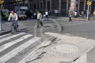 MÉXICO, D.F., 17ENERO2012.- Un bache dificulta el transito en las calles de 5 de Mayo y Plaza de la Constitución. El hoyo es producto de los trabajos de mantenimiento que la Comisión Federal de Electricidad ha estado haciendo en el primer cuadro debido a los problemas de cortos circuitos que se han presentado en las llamadas mufas. FOTO: MOISÉS PABLO/CUARTOSCURO.COM