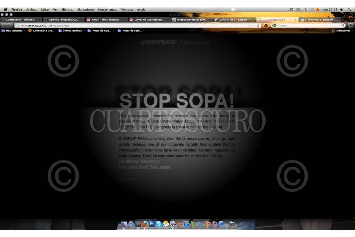 MÉXICO, D.F., 18ENERO2012.- El día de hoy mas de 10 mil sitios web, que en su mayoría radican en Estados Unidos, realizaron una protesta en contra de la iniciativa de ley SOPA y ley PIPA, por sus siglas en ingles, que impulsa legisladores norteamericanos y que buscan detener el flujo libre de información en internet y calificar de pirateria este flujo. La protesta durará 24 horas. En México paginas como Wikipedia y Greenpeace, solo protestaron con leyendas alusivas al tema. FOTO: ESPECIAL/CUARTOSCURO.CO