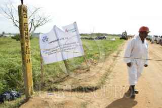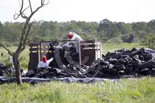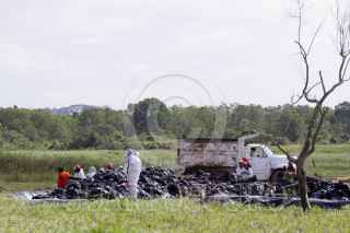 CÓSOLOACAQUE, VERACRUZ, 18ENERO2012.- Empleados subcontratados por Petróleos Mexicanos laboran a marcha forzada en las inmediaciones de la válvula de seccionamiento El Polvorín, donde al menos se han derramado ochocientos mil litros de crudo de petróleo en las aguas del río Coatzacoalcos como de igual manera en otros medios acuosos. FOTO: MARCO POLO GUZMÁ HERNÁNDEZ/CUARTOSCURO.COM