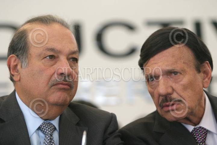 MEXICO, D.F. 06ENERO2005.- Heladio Ramírez, líder de la Confederación Nacional Campesina y los empresarios, Carlos Slim y Roberto Gonzalez, durante la Ceremonia del XC Aniversario de la Promulgación de la Ley Agraria. FOTO: Eunice Adorno/CUARTOSCURO.COM