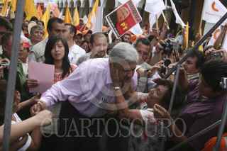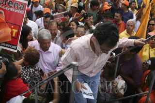 SAYULA, JALISCO, 19ENERO2012.- Andrés Manuel López Obrador, candidato de los partidos PRD, PT y Movimiento Ciudadano a la presidencia de la República, a su llegada a un mítin en la explanada municipal. FOTO: IVÁN STEPHENS/CUARTOSCURO.COM