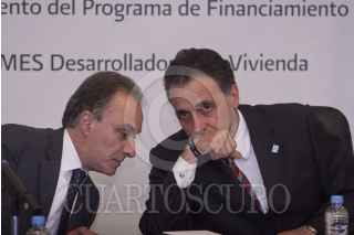 MÉXICO D.F., 19ENERO2012.- Miguel Marón, subsecretario para la Pequeña y Mediana Empresa, conversa con Bruno Ferrari, secretario de Economía, presentaron el fondo de garantía para respaldar créditos de instituciones financieras a pequeñas y medianas empresas desarrolladoras de vivienda, con lo que se prevé detonar un financiamiento por al menos mil 500 millones de pesos al sector. FOTO: ISAAC ESQUIVEL/CUARTOSCURO.COM