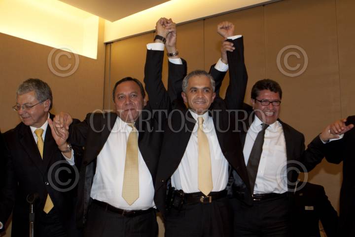 MÉXICO, D.F., 19ENERO2012.- Miguel Ángel Mancera, exprocurador de Distrito Federal resulto ganador de la encuesta con cual se convierte en el candidato del Movimiento Progresista, por parte del PRD; lo acompaña Jesus Zambrano, Ricardo Monreal, Luis Walton. FOTO: RODOLFO ANGULO/CUARTOSCURO.COM