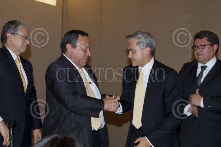 MÉXICO, D.F., 19ENERO2012.- Miguel Ángel Mancera, exprocurador de Distrito Federal resulto ganador de la encuesta con cual se convierte en el candidato del Movimiento Progresista, por parte del PRD; lo acompaña Jesus Zambrano, Ricardo Monreal, Luis Walton. FOTO: RODOLFO ANGULO/CUARTOSCURO.COM