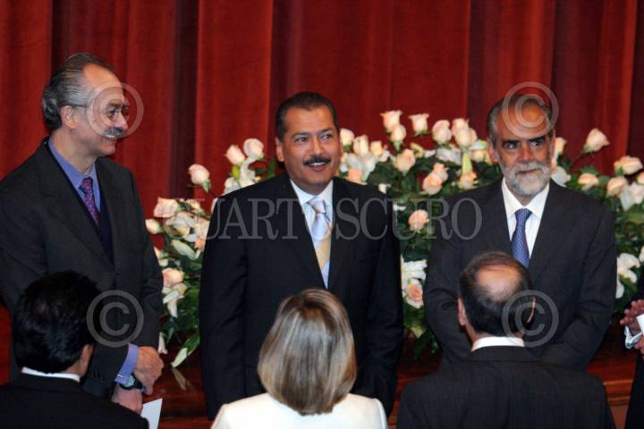 MEXICO, D.F. 07ENERO2005.- Santiago Creel, Secretario de Gobernación, Diego Fernández de Cevallos, presidente del Senado y Manlio Fabio Beltrones, presidente de la Cámara de Diputados durante la ceremonia del 66 Aniversario de la Promulgación del Estatuto Jurídico de la Federación de Sindicatos de Trabajadores al Servicio del Estado. FOTO: Moisés Pablo/CUARTOSCURO.COM